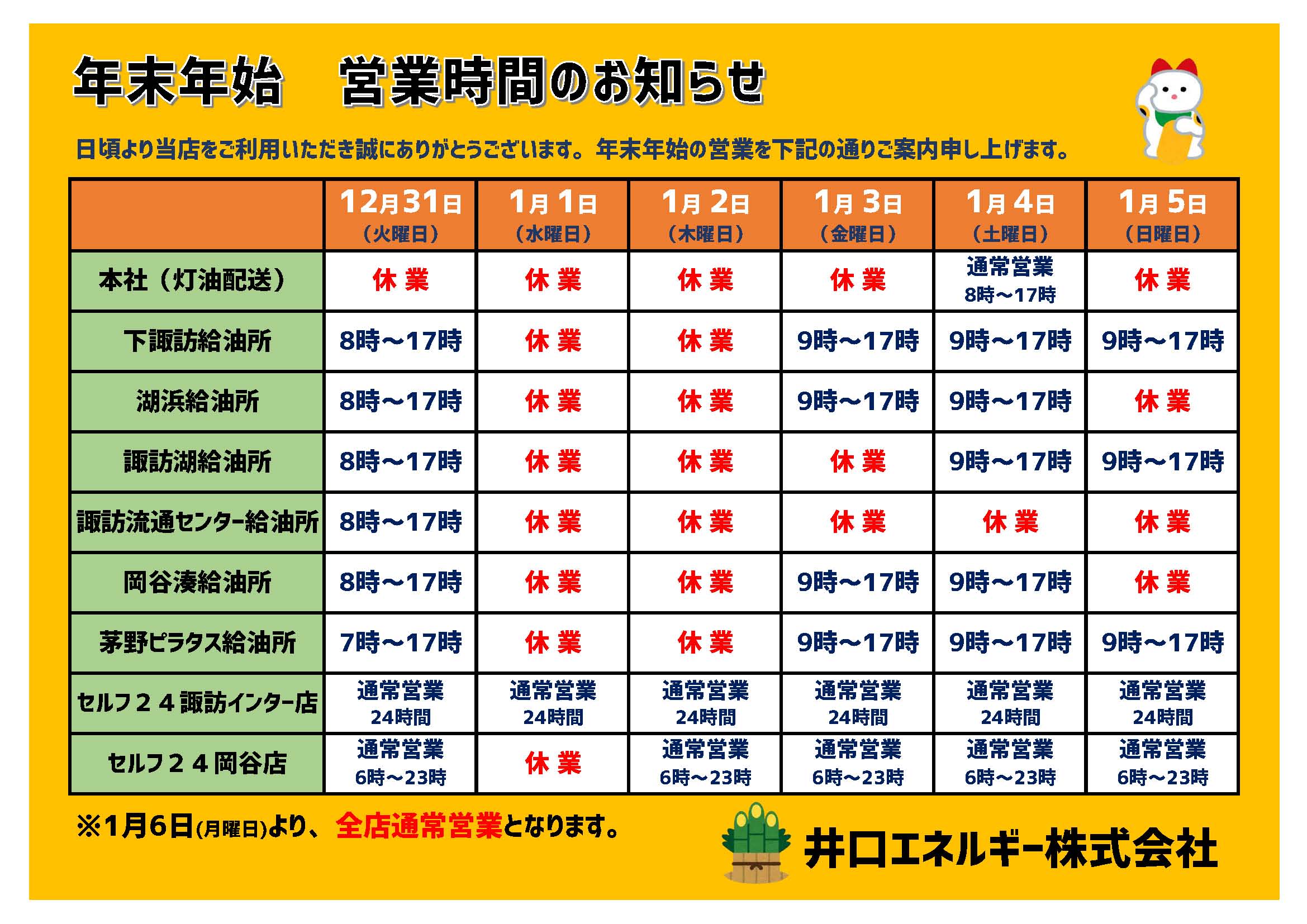 2019年12月31日(火)から2020年1月5日(日)の年末年始の期間、下記の通り営業時間の変更をさせていただきます。