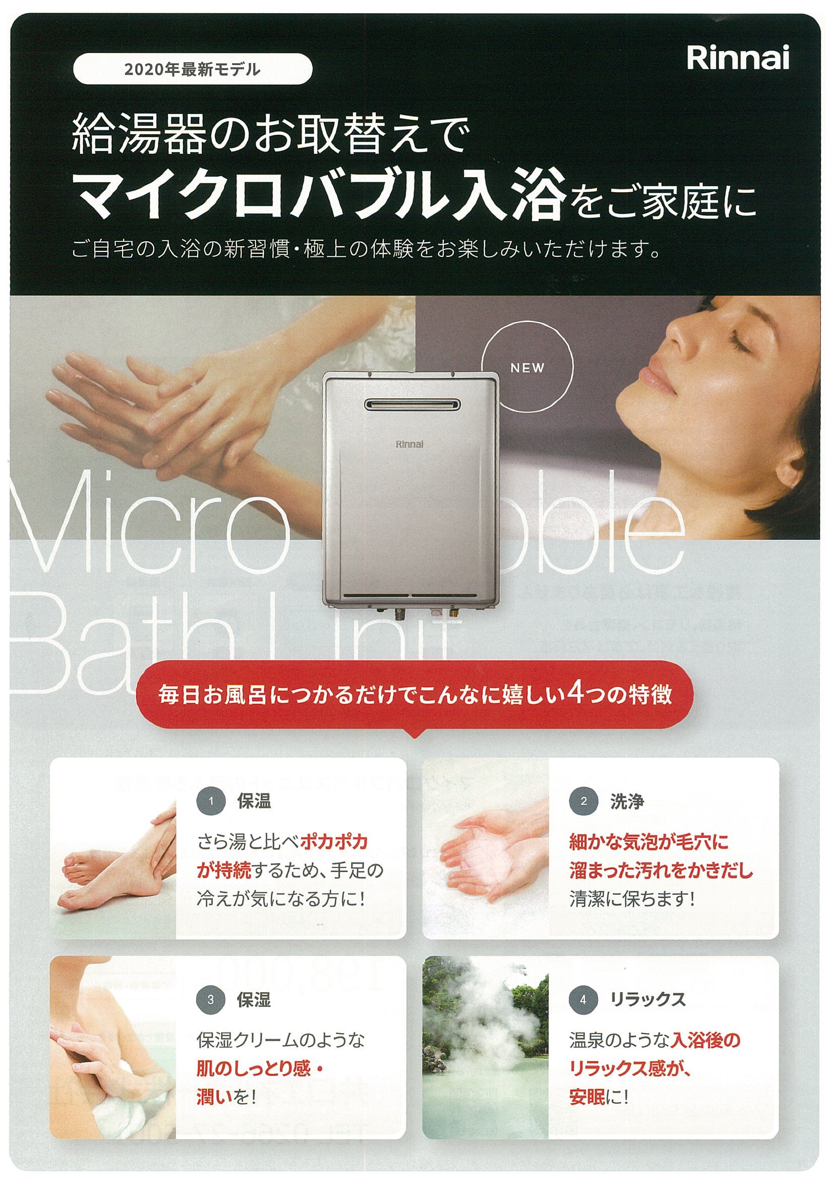 リンナイ給湯器の新商品マイクロバブルユニット内臓給湯器のご紹介です。